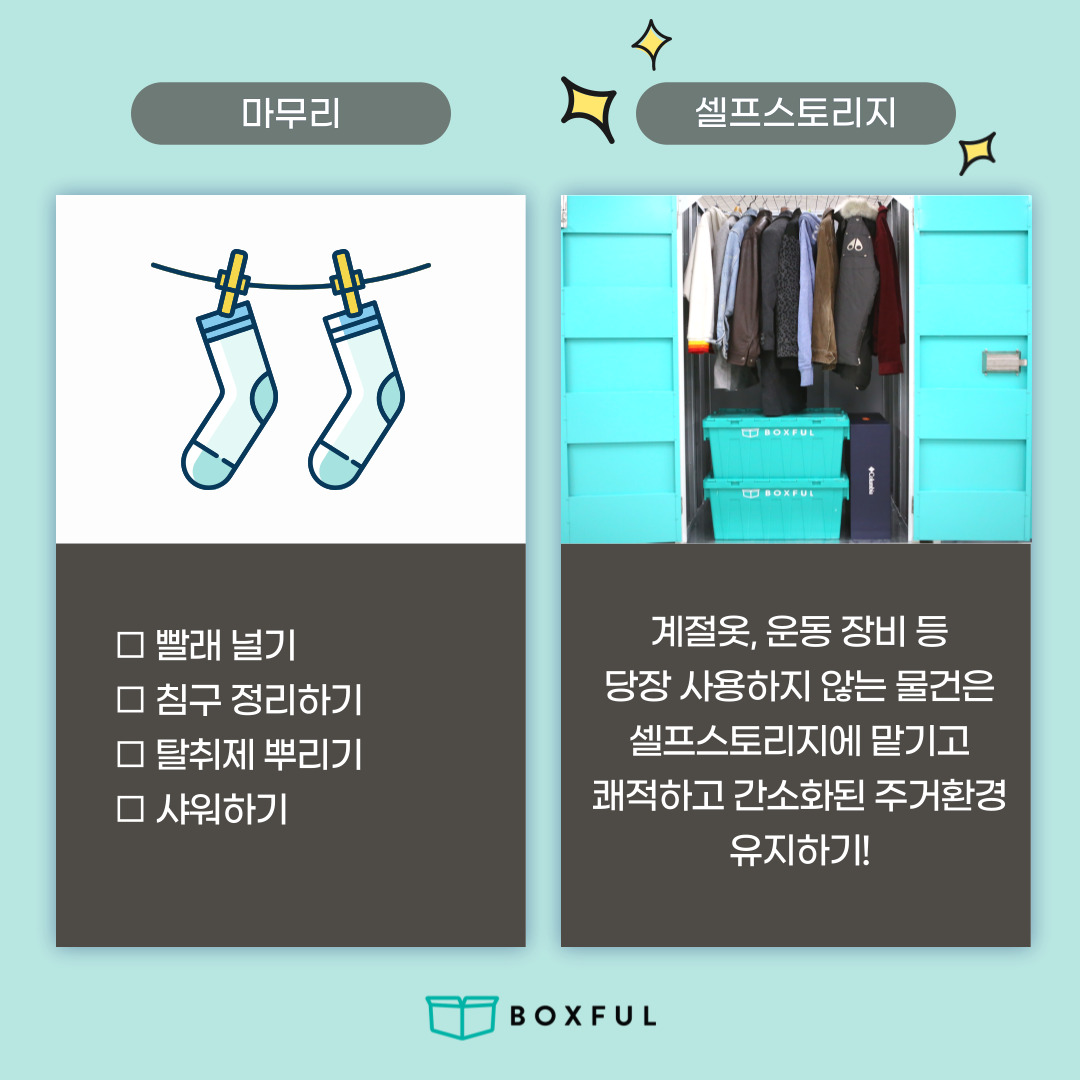 박스풀 공유창고에 맡기고 청소 후 쾌적하고 간소화된 주거환경을 오래 유지해보세요.