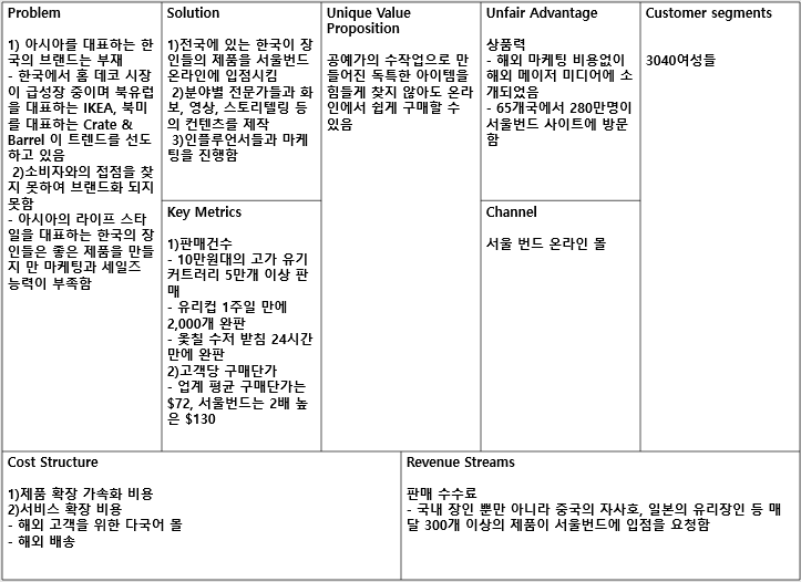 이상으로 데모데이를 바탕으로 한 '서울 번드'의 린 캔버스 작성이 완료되었습니다:)